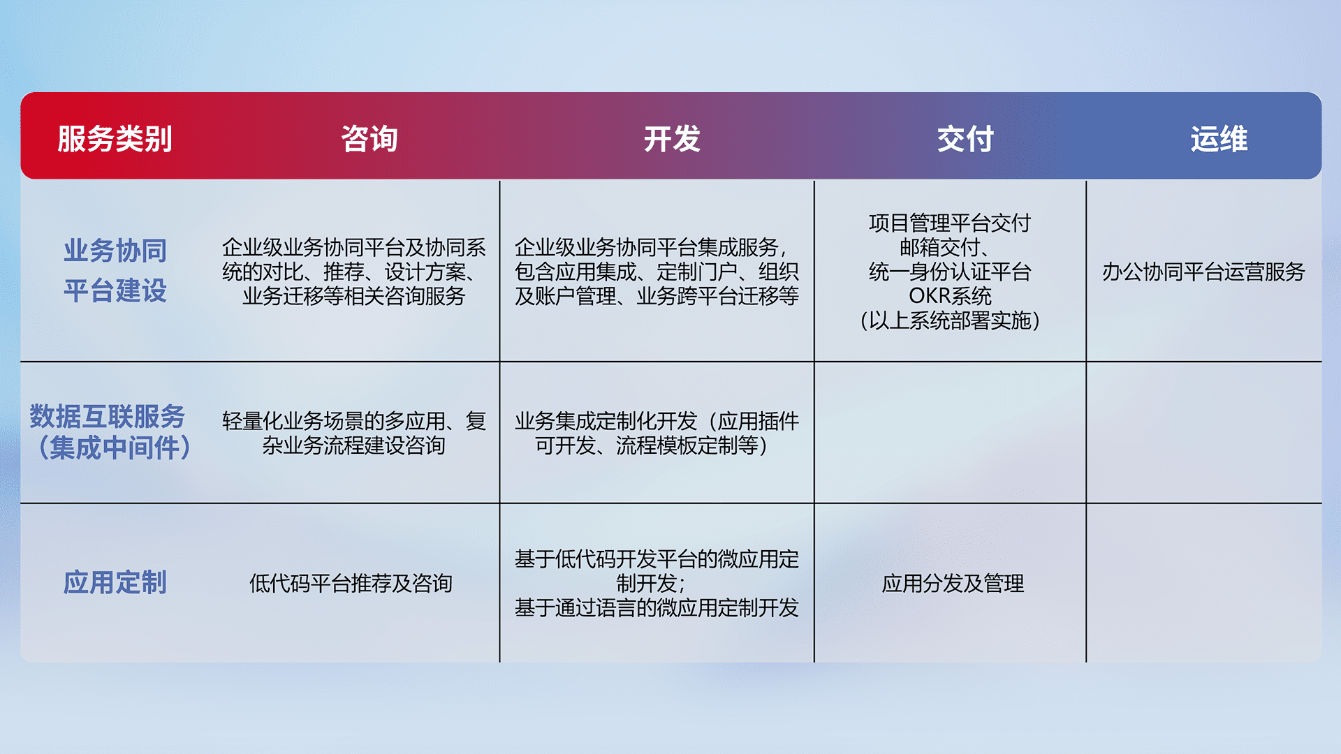 针对钉钉、、、、企微、、、IDaas等平台级产品提供产品的规划、、、、方案、、交付、、、、定制化开发等服务,,,,实现如统一协同办公、、智能客户服务、、、混合会议管理、、智能数据查询、、等业务场景,,实现数字化转型。。。。