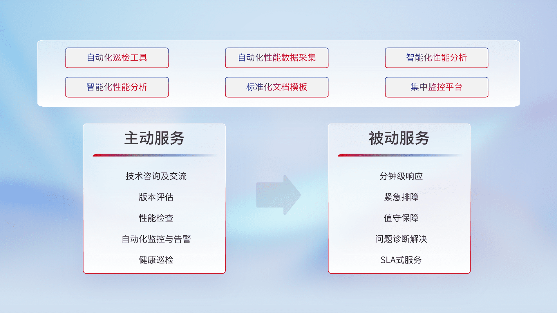 智能化工具和标准化文档,,,保障服务质量,,,,提供主动服务(包含技术咨询、、、版本评估、、性能检查、、自动化监控与告警、、、、健康巡检)和被动服务包含(分钟级响应、、、、紧急排障、、、、值守保障、、问题诊断解决、、、、SLA服务)。。